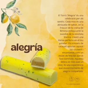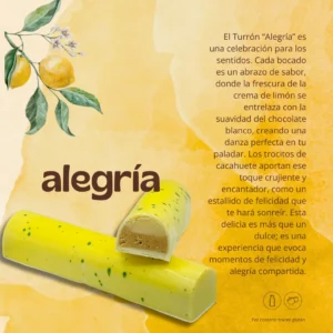 El Turrón Alegría es una danza de sabores: la suavidad del chocolate blanco se funde con la crema de cacahuete y el toque vibrante de ganache de limón, creando una sensación luminosa y envolvente.